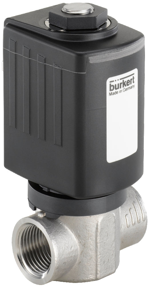 This is a Burkert semi-direct operating 2/2 way solenoid valve with G 3/8 inch threads and a 24 V DC coil. The valve has a stainless steel housing with FKM sealing and an orifice size of 6 mm. The circuit function of the solenoid valve is normally closed, which means the valve opens when voltage is applied. As it is semi-direct operating, no pressure differential over the valve is needed to open the valve. Suitable for a pressure range of 0 to 16 bar (232 psi) and a maximum temperature of 140 °C (284 °F). The valve has a Kv-value of 0.6 m3/h, this translates to a flow rate of 10 l/min at a differential pressure of 1 bar (for water). In imperial units: Cv = 1, which means 1 GPM @ 1 psi pressure drop. For many applications it is enough to select a valve based on the thread size and orifice diameter. For more accurate sizing, use the Kv-value with our easy to use valve sizing calculator. The stainless steel housing is very durable, strong and resistant to a wide range of chemicals with the exception of chloride solutions. The FKM (fluorine rubber or Viton) sealing has excellent chemical properties, is suited for most oils and solvents but it cannot handle hot water or steam. Please note that the internal valve parts, such as the stainless steel plunger and springs, are also in contact with the medium and must be chemically compatible. Consult our chemical resistance chart to verify compatibility of housing and seals with the medium. The valve has an IP65 rating if properly connected.