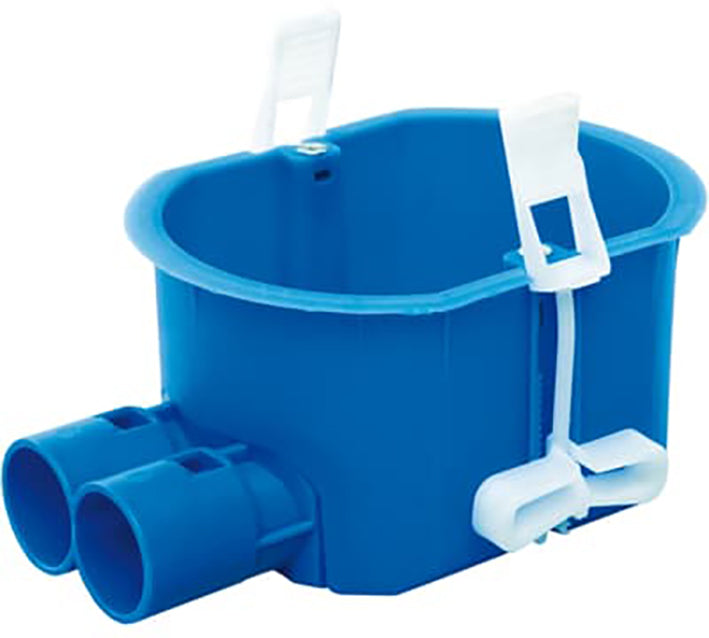 Professional-grade hollow wall junction box with 50mm depth, designed for double socket installation. Features dual cable entries (16/19mm) and quick-fixing straps for tool-free installation in cavity walls. Compatible with various wall thicknesses and includes a marking template. Requires 76mm drill hole for mounting.