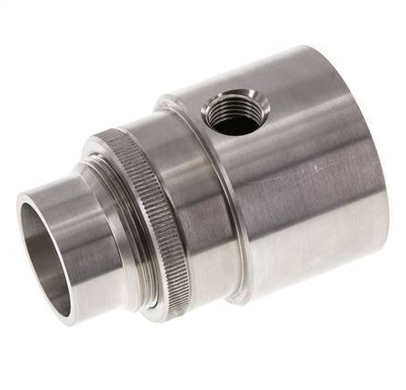 This is an adjustable air amplifier with a 32 mm outlet made out of stainless steel. It has an Rp 1/4“ female threaded input. It can function like a vacuum, fan or blower to vacuum or blow out debris, gases, granules and fiber materials. To be used only with filtered and unoiled compressed air. The air comes in through a significantly larger 50 mm hole and comes through a 32 mm outlet port amplified thanks to the reduction of the hole diameter.