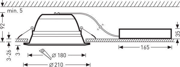 Professional recessed LED downlight featuring 1900lm output at 106 lm/W efficiency. Includes highly specular reflector with narrow symmetric beam distribution. Features 3000K warm white light, CRI>80, and PMMA prismatic diffuser. Rated for 25,000 hours L80 lifespan with replaceable LED source and control gear. Installation via spring mounting into 180-195mm ceiling cutouts. IP20/IP44 rated with IK02 impact protection.