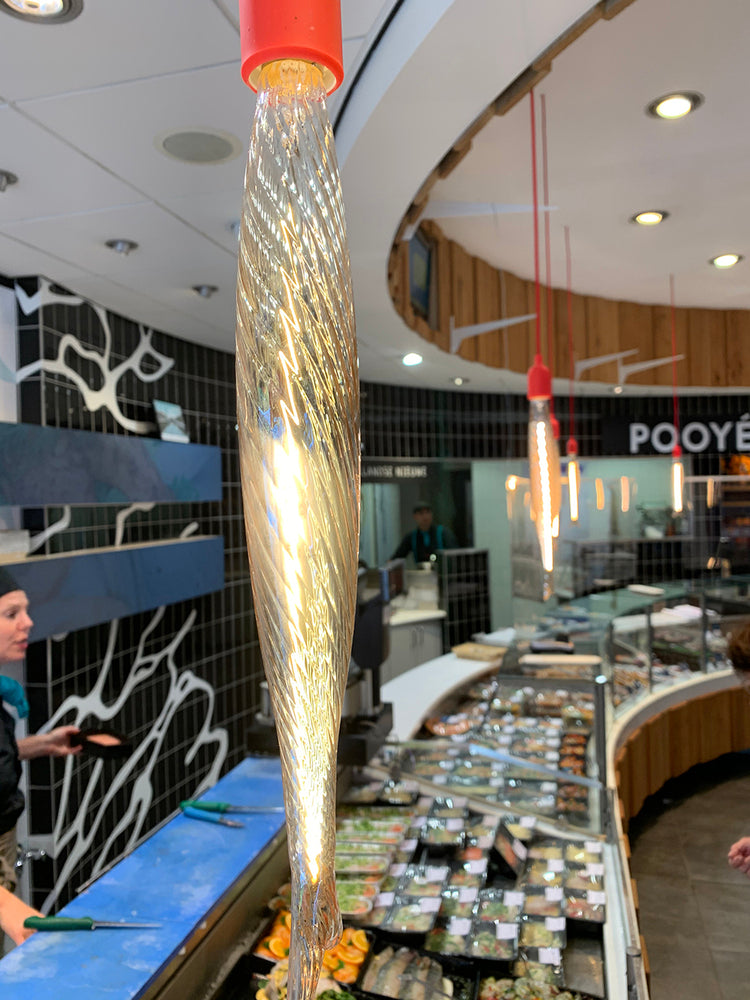 Decorative fish-shaped LED filament lamp with E27 base and gold coating. Features a distinctive scale pattern that evenly distributes warm 2200K light. Provides 240 lumens output while consuming only 4W (equivalent to 24W traditional). Compatible with LED dimmers and standard E27 sockets. Operating voltage 230-240V with 320-degree beam spread.