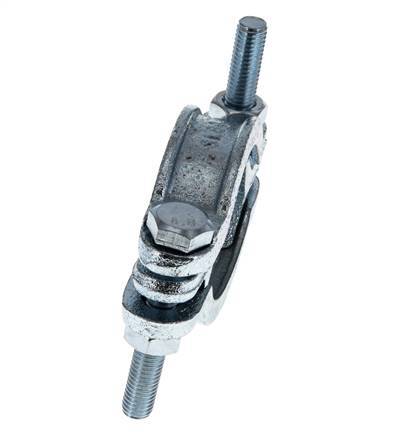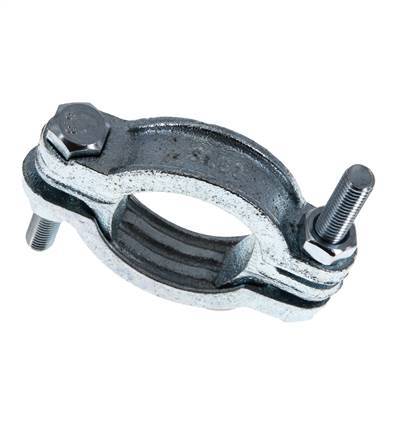 Hose clamp for compressor claw couplings (DIN 20039A). Made from malleable cast iron. Suitable for a hose diameter between 48-60 mm. The hose clamp exist out of two parts that are clamped around the hose with two bolts. These hose clamps are designed to use together with compressor claw couplings.