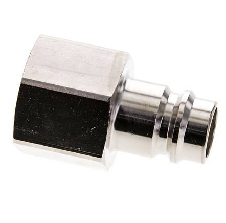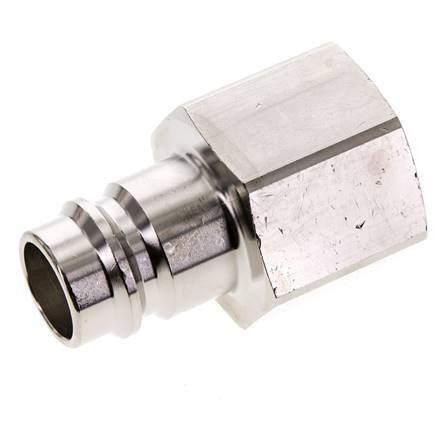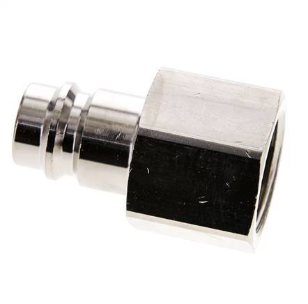 Nickel-plated brass DN 19 air coupling plug with G 1 inch female threads. The operating pressure range is 0 (suitable for coarse vacuums) to 35 bar. The plug is suitable for temperatures between -20 to 100°C. The flow rate is 8000 l/min.