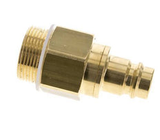 Brass DN 19 air coupling plug with G 1 1/4 inch male threads. A pneumatic coupling is used to quickly connect air tools to a compressed air line. The coupling requires two parts: the socket (female) and the plug or nipple (male part). When disconnected, the coupling automatically shuts off to maintain the line pressure.