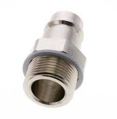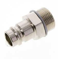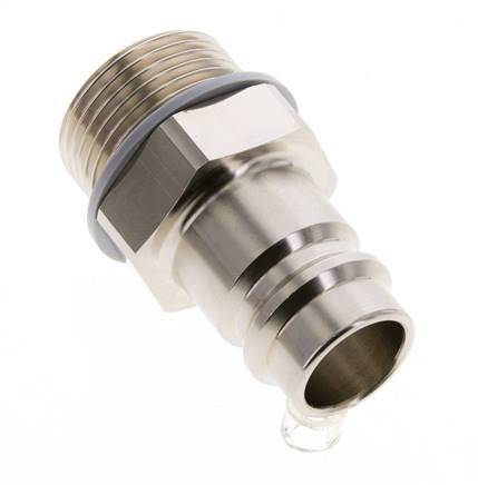 The G 1 inch male threads allow for it to be threaded onto a matching female threaded part. This coupling is suitable for vacuum applications. The operating pressure range is 0 to 35 bar. The plug is suitable for temperatures between -20 to 100°C. The rated flow rate is 8000 l/min. The seal material is hard plastic. The Nickel-plated brass housing has a nickel-plated surface protection.