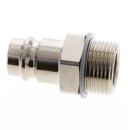 Nickel-plated brass DN 19 air coupling plug with G 1 inch male threads. The operating pressure range is 0 (suitable for coarse vacuums) to 35 bar. The plug is suitable for temperatures between -20 to 100°C. The flow rate is 8000 l/min. The seal material is hard plastic.