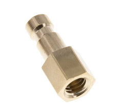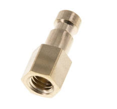 Brass DN 2.7 (micro) air coupling plug with M5 female threads. A pneumatic coupling is used to quickly connect air tools to a compressed air line. The coupling requires two parts: the socket (female) and the plug or nipple (male part). When disconnected, the coupling automatically shuts off to maintain the line pressure.