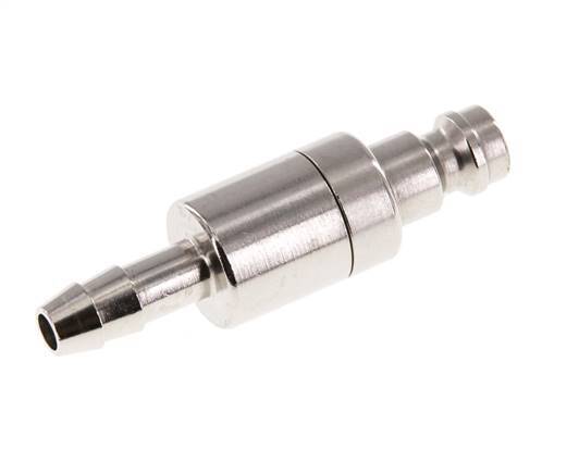 Nickel-plated brass DN 5 air coupling plug with a 6 mm hose pillar connection. A pneumatic coupling is used to quickly connect air tools to a compressed air line. The coupling requires two parts: the socket (female) and the plug or nipple (male part). When disconnected, the coupling automatically shuts off to maintain the line pressure.