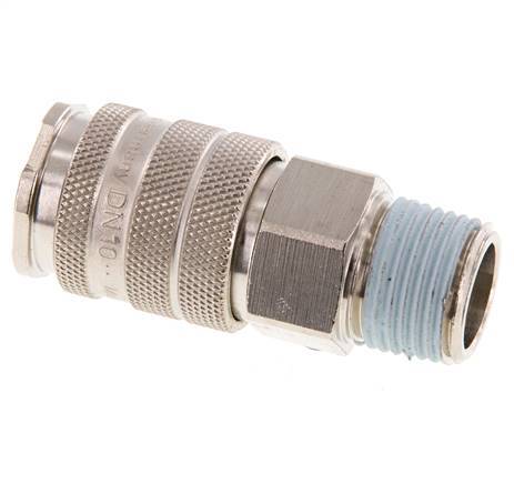 Nickel-plated brass DN 10 air coupling socket with R 1/2 inch male threads. A pneumatic coupling is used to quickly connect air tools to a compressed air line. The coupling requires two parts: the socket (female) and the plug or nipple (male part). When disconnected, the coupling automatically shuts off to maintain the line pressure.