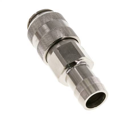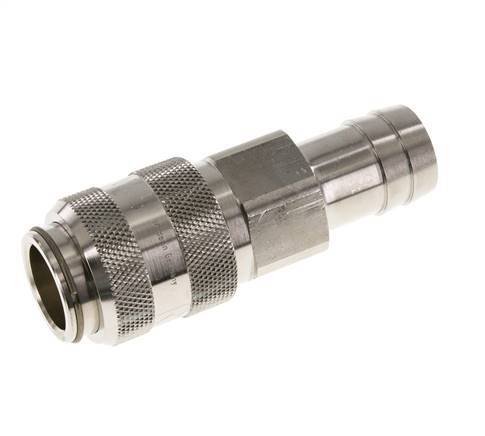 Easily mount a hose over the 25 mm hose pillar. Optionally, order a hose clamp for proper fixation of the hose. This coupling is suitable for vacuum applications. The socket has a double sided shut-off design. They can be used with normal plugs and with 'double-sided shut off' plugs. When double-sided shut off plugs are disconnected, they shut off flow in both directions. The operating pressure range is 0 to 35 bar. The socket is suitable for temperatures between -20 to 100°C. The rated flow rate is 5000 l/min. The seal material is NBR (nitrile rubber). The Nickel-plated brass housing has a nickel-plated surface protection.