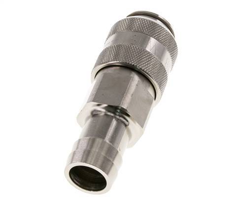 Nickel-plated brass DN 15 air coupling socket with a 25 mm hose pillar connection. The socket has a double sided shut-off design. The operating pressure range is 0 (suitable for coarse vacuums) to 35 bar. The socket is suitable for temperatures between -20 to 100°C. The flow rate is 5000 l/min. The seal material is NBR (nitrile rubber).