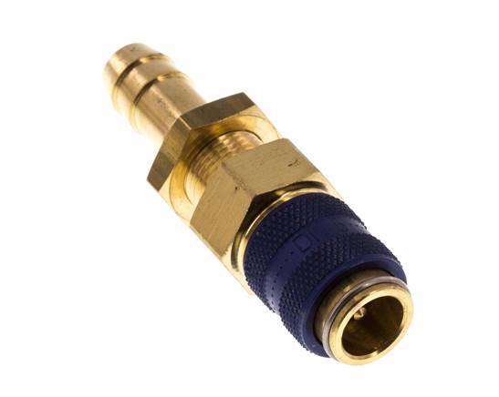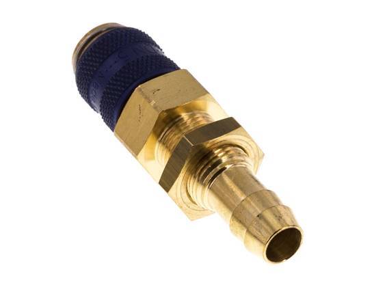 Brass DN 5 air coupling socket with a 9 mm hose pillar connection and bulkhead thread. The socket has a double sided shut-off design. The operating pressure range is -0.95 (suitable for vacuums) to 35 bar. The socket is suitable for temperatures between -20 to 100°C. The flow rate is 360 l/min. The seal material is NBR (nitrile rubber). It has a blue color.