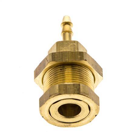 Brass DN 5 air coupling socket with a 4 mm hose pillar connection and bulkhead thread. These sockets have a special 'pull-off' design, which allows decoupling by simply pulling on the plug and hose. A pneumatic coupling is used to quickly connect air tools to a compressed air line. The coupling requires two parts: the socket (female) and the plug or nipple (male part). When disconnected, the coupling automatically shuts off to maintain the line pressure.