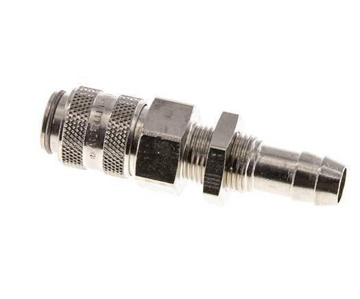 Nickel-plated brass DN 5 air coupling socket with a 9 mm hose pillar connection and bulkhead thread. A pneumatic coupling is used to quickly connect air tools to a compressed air line. The coupling requires two parts: the socket (female) and the plug or nipple (male part). When disconnected, the coupling automatically shuts off to maintain the line pressure.