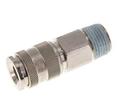 Nickel-plated brass DN 5.5 (Orion) air coupling socket with R 1/2 inch male threads. A pneumatic coupling is used to quickly connect air tools to a compressed air line. The coupling requires two parts: the socket (female) and the plug or nipple (male part). When disconnected, the coupling automatically shuts off to maintain the line pressure.