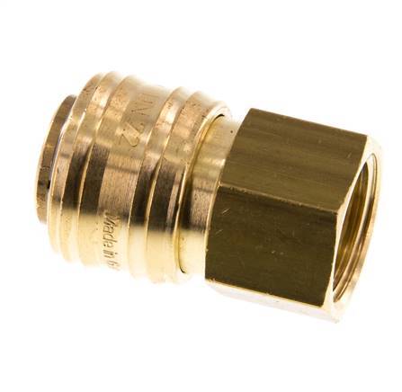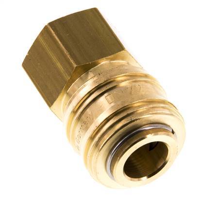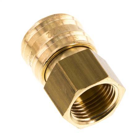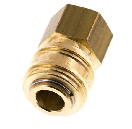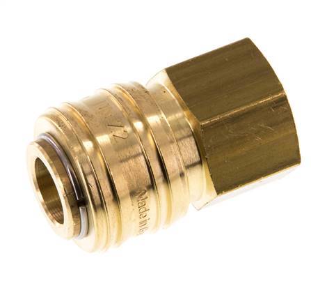 Brass DN 7.2 (Euro) air coupling socket with G 1/2 inch female threads. A pneumatic coupling is used to quickly connect air tools to a compressed air line. The coupling requires two parts: the socket (female) and the plug or nipple (male part). When disconnected, the coupling automatically shuts off to maintain the line pressure.