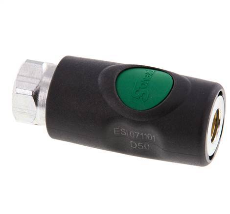 Composite material DN 7.4 safety air coupling socket with G 1/4 inch female threads. These safety couplings release the down-line air pressure by pushing the button on the socket. We recommend to use hardened steel nipples for safety couplings. The operating pressure range is 0 to 12 bar. The socket is suitable for temperatures between -15 to 70°C. The flow rate is 1500 l/min. The seal material is NBR (nitrile rubber).