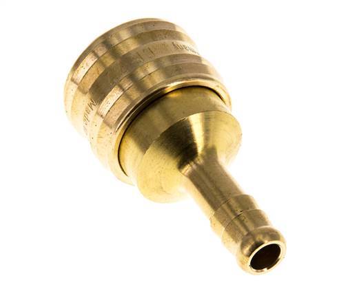 Brass DN 7.2 (Euro) air coupling socket with a 8 mm hose pillar connection. The socket has a double sided shut-off design. The operating pressure range is -0.95 (suitable for vacuums) to 35 bar. The socket is suitable for temperatures between -20 to 100°C. The flow rate is 800 l/min. The seal material is NBR (nitrile rubber).