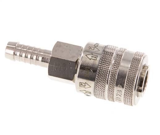 Nickel-plated brass DN 7.8 safety air coupling socket with a 9 mm hose pillar connection. These safety couplings release the down-line air pressure by pulling the sleeve on the socket. We recommend to use hardened steel nipples for safety couplings. The operating pressure range is 0 to 12 bar. The socket is suitable for temperatures between -20 to 100°C. The flow rate is 1800 l/min. The seal material is NBR (nitrile rubber).