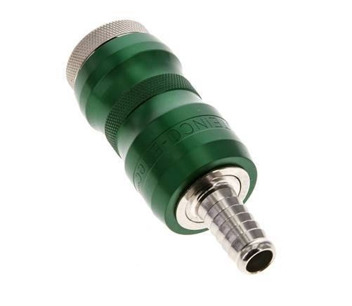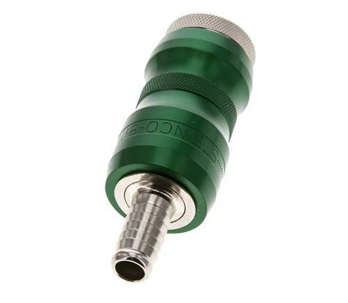 These safety couplings release the down-line air pressure at the plug side in a safe, controlled manner by pulling the sleeve on the socket. The plug will not be released before the pressure at the plug side reaches a safe low level. This prevents the risk of a dangerous bull whip effect which may cause damage to man and machine. We recommend to use hardened steel plugs with these couplings. Easily mount a hose over the 10 mm hose pillar. Optionally, order a hose clamp for proper fixation of the hose. The operating pressure range is 0 to 20 bar. The socket is suitable for temperatures between -20 to 100°C. The rated flow rate is 2050 l/min. The seal material is NBR (nitrile rubber). The sleeve material is aluminium. The Nickel-plated brass housing has a nickel-plated surface protection.