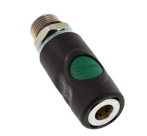 Composite material DN 7.4 safety air coupling socket with G 1/2 inch male threads. These safety couplings release the down-line air pressure by pushing the button on the socket. We recommend to use hardened steel nipples for safety couplings. The operating pressure range is 0 to 12 bar. The socket is suitable for temperatures between -15 to 70°C. The flow rate is 1500 l/min. The seal material is NBR (nitrile rubber).