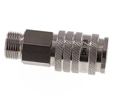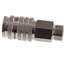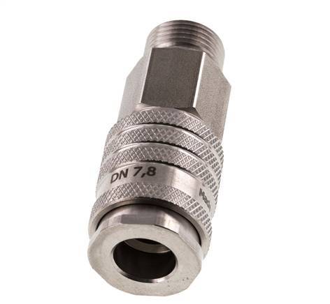 Stainless steel DN 7.8 air coupling socket with G 3/8 inch male threads. A pneumatic coupling is used to quickly connect air tools to a compressed air line. The coupling requires two parts: the socket (female) and the plug or nipple (male part). When disconnected, the coupling automatically shuts off to maintain the line pressure.