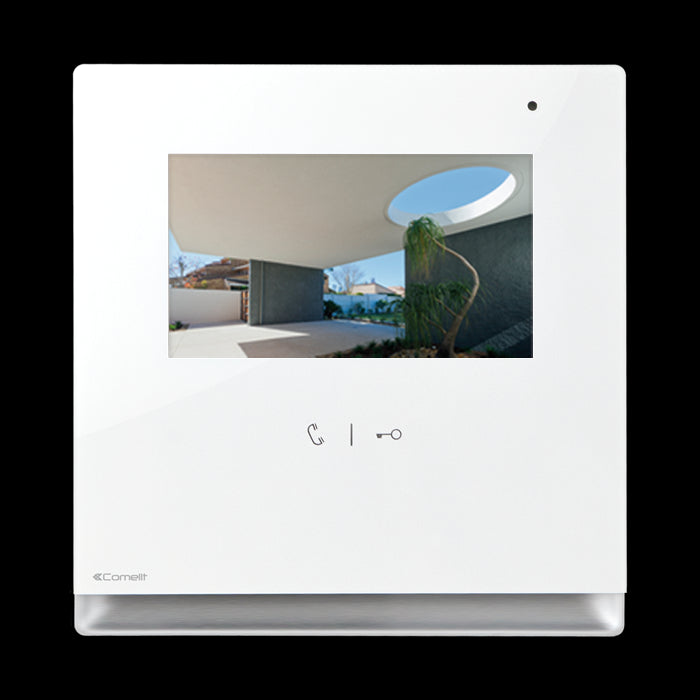 Monitor for installation (in box product no. 6117) or overlay (with support product no. 6620) with 4.3 inch 16:9 screen, hands-free full-duplex speaker and touch-sensitive controls. It allows the adjustment of brightness, contrast, conversation volume and ringtone volume. The ringtone can be personalized by choosing from multiple ringtones.