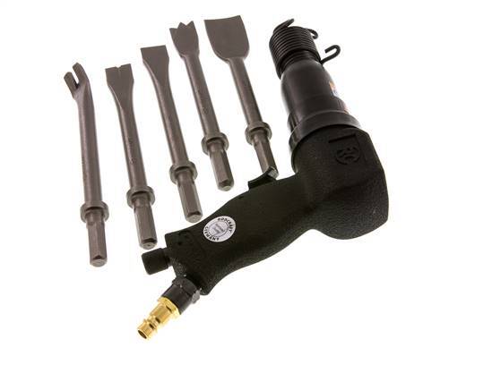 This is a compressed air chisel hammer set consisting of an air hammer and five chisels. Equipped with an Rp 1/4“ air inlet connection. Air consumption is at 400 l/min with 3000 blows per minute and 60 mm stroke. Operating pressure is at 6 bar.