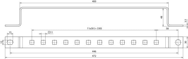 The earthing busbar is designed for mounting on steel structures and is used to connect flat conductors with a hole or round conductors, for instance with a KS connector. This specific type features 12 terminals with 11mm holes (D11). It is an integral component for grounding and lightning protection systems, ensuring the safe dissipation of electrical energy.