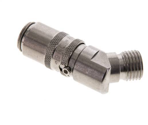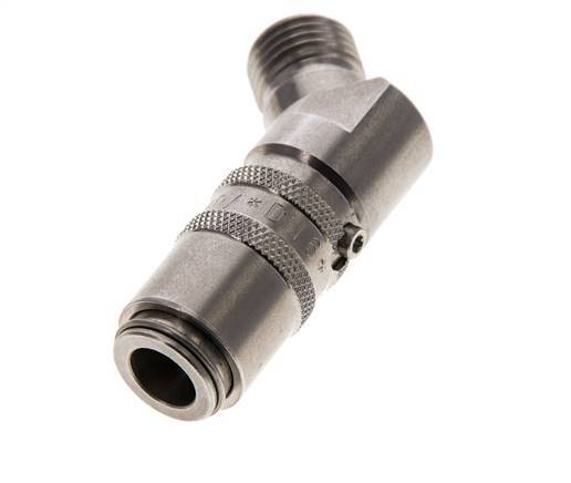 The M14x1.5 mm male threads allow for it to be threaded onto a matching female threaded part. The coupling has a non-return valve to prevent backflow and the push-in socket also closes when disconnected. This is considered a double-sided shut-off design. The operating pressure range is 0 to 15 bar (0 to 218 psi). The coupling is suitable for temperatures between -20 to 160 °C (-4 to 320 °F). The seal material is FKM. The housing material is stainless steel 303 (1.4305). The bend angle is 45 deg.
