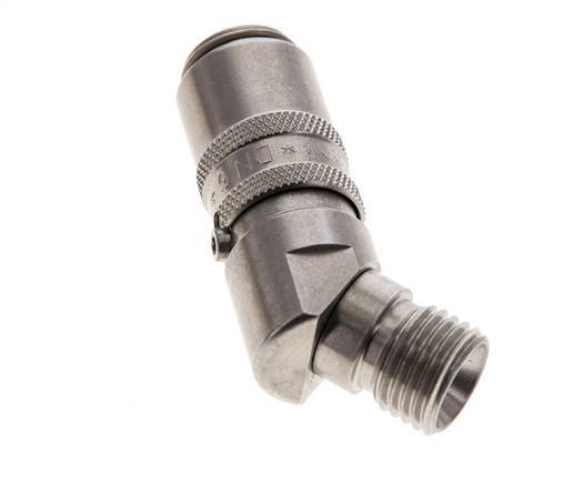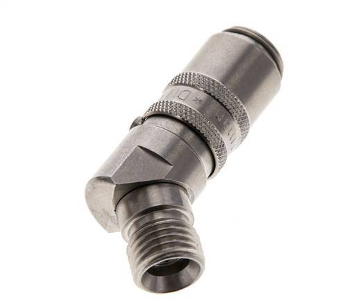 Stainless steel DN 6 mold coupling socket with M14x1.5 male threads. The coupling has a non-return valve to prevent backflow and the push-in socket also closes when disconnected. The operating pressure range is 0 to 15 bar (0 to 218 psi). The coupling is suitable for temperatures between -20 to 160 °C (-4 to 320 °F). The seal material is FKM. The bend angle is 45 deg.