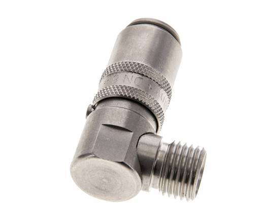 The M14x1.5 mm male threads allow for it to be threaded onto a matching female threaded part. The coupling has a non-return valve to prevent backflow and the push-in socket also closes when disconnected. This is considered a double-sided shut-off design. The operating pressure range is 0 to 15 bar (0 to 218 psi). The coupling is suitable for temperatures between -20 to 160 °C (-4 to 320 °F). The seal material is FKM. The housing material is stainless steel 303 (1.4305). The bend angle is 90 deg.