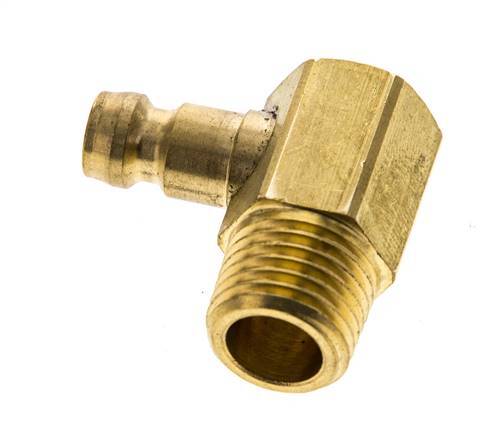 Brass DN 6 mold coupling plug with M14x1.5 male threads (conical). The operating pressure range is 0 to 15 bar (0 to 218 psi). The coupling is suitable for temperatures between -20 to 160 °C (-4 to 320 °F). The bend angle is 90 deg.