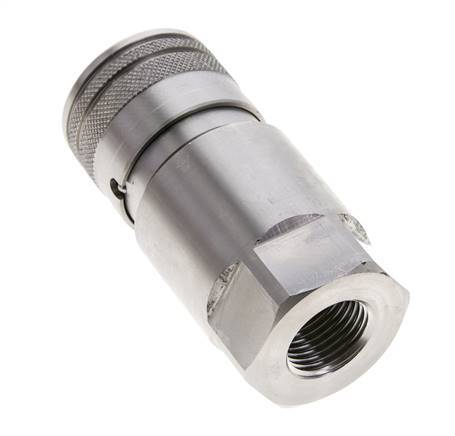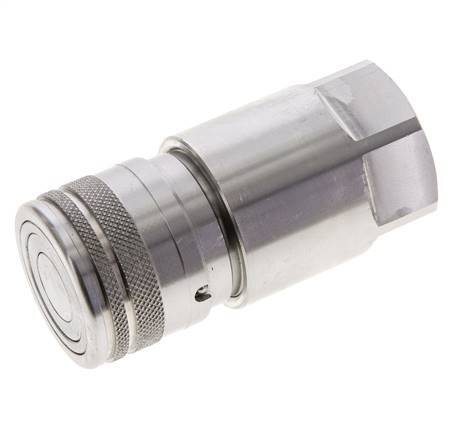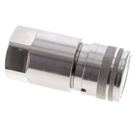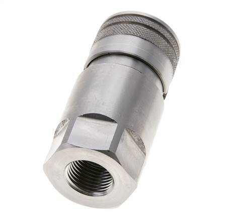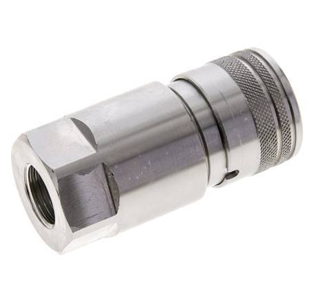 Stainless steel DN 12 flat face hydraulic socket with G 1/2 inch female threads. They are typically used for liquid lines to quickly connect and disconnect secure connections.
