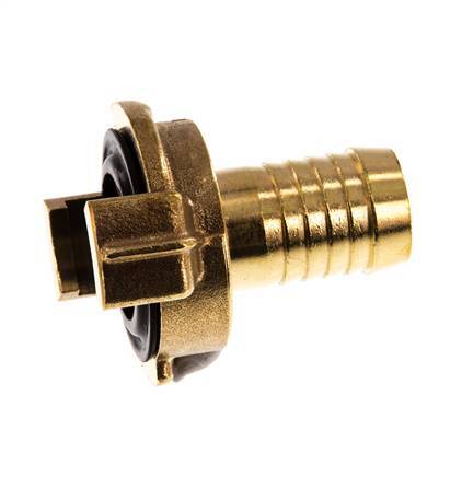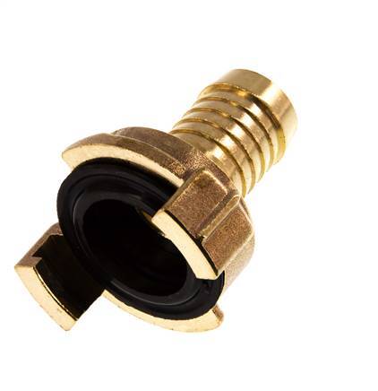 This is a garden hose coupling (also known as GEKA) with a 19 mm (3/4 inch) hose barb. The garden hose coupling has a symmetrical and non shut-off design with a 40 mm distance between the claws. It is made of brass with an NBR (nitrile rubber) seal. The maximum operating pressure is 25 bar (363 psi). The coupling is suitable for temperatures between 0 to 80 °C (32 to 176 °F).