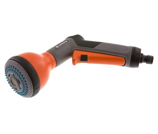 This is a water sprayer with a GARDENA connection. It has three spray settings: hard jet, rain jet, or shower. The trigger allows for continuous flow adjutment. Suitable 0 °C to +40 °C and 0 - 10 bar for water. It is made of PP, ABS, and has an EPDM seal.