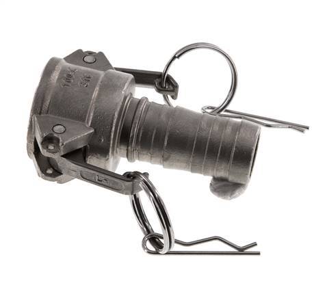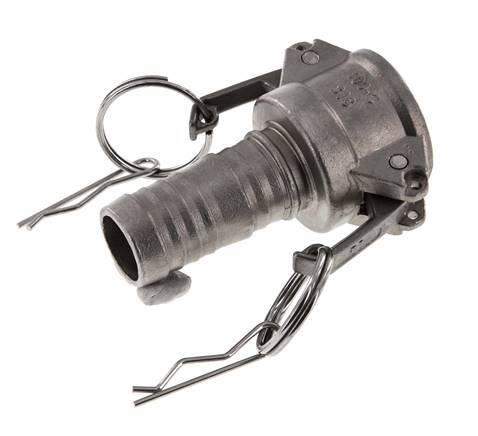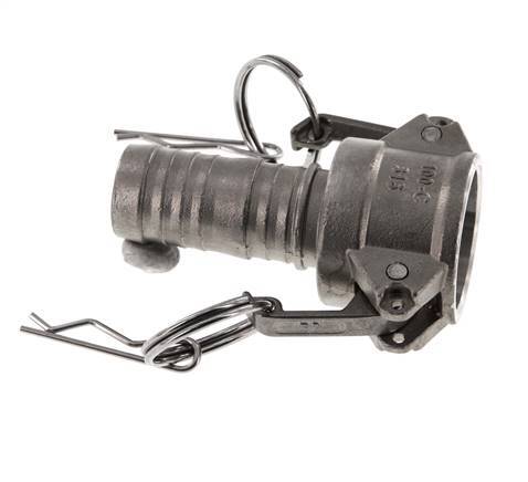 Stainless steel DN 25 (1 inch) Camlock coupling socket with 25 mm hose pillar. This coupling is a Type C coupling (straight socket with hose barb end). The maximum operating pressure is 18 bar (261 psi). The coupling is suitable for temperatures between -10 to 80 °C (14 to 176 °F). It has an NBR (nitrile rubber) seal. The coupling adheres to the MIL-C-27487 standard.
