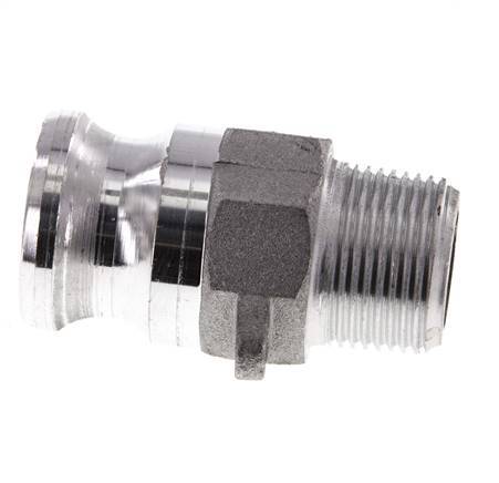 Aluminium DN 20 (3/4 inch) Camlock coupling adapter (male) with R 3/4 inch male thread. This coupling is a Type F coupling (plug with male threaded end). The maximum operating pressure is 18 bar (261 psi). The coupling is suitable for temperatures between -10 to 80 °C (14 to 176 °F). It has an NBR (nitrile rubber) seal. The coupling adheres to the MIL-C-27487 standard.
