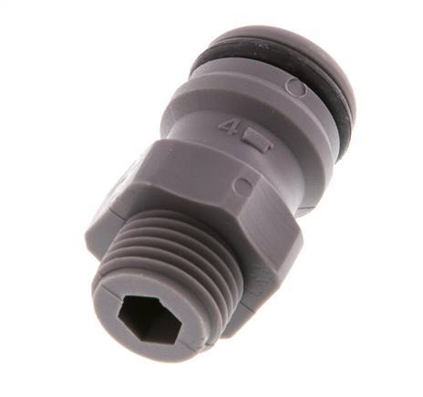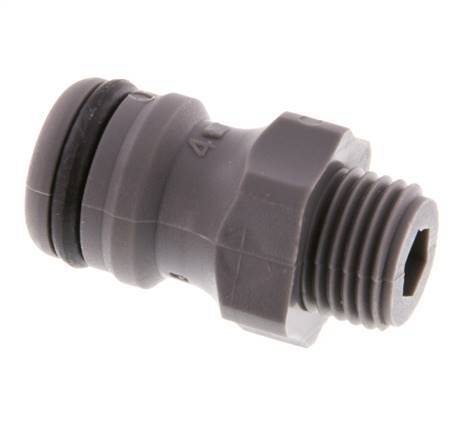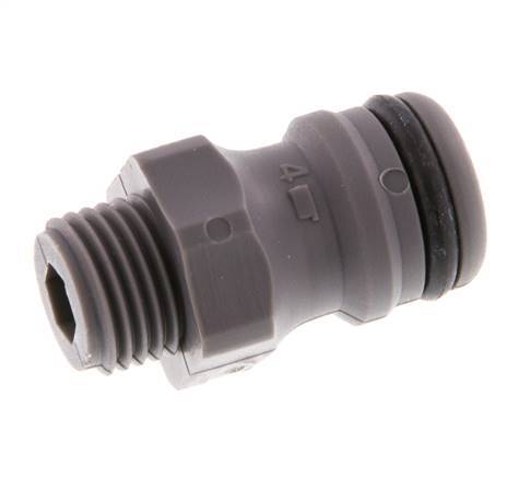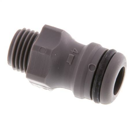 Plastic garden hose fitting with 1/4 male thread, suited for GARDENA fittings.