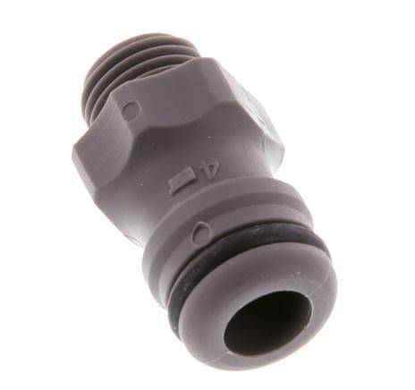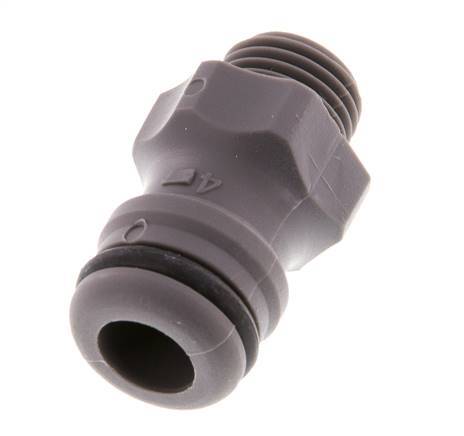 Plastic garden hose fitting with G1/4" male thread, suited for GARDENA fittings. Temperature range from 0 to 60°C and pressure range from 0 to 8bar.