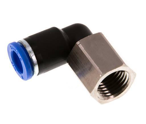 This is a 2 connection elbow push-in fitting. Push-in fittings are ideal to create fast and reliable connections for pneumatic hoses. Connection 1 is a 8 mm push-in port. Connection 2 has G 1/4 inch female threads. The male thread connection has PTFE-coating. The body is made of PA 66. The connection ports are made of nickel plated brass and PA 66. The seal material is NBR. The operating pressure range is -0.95 to 20 bar (-14 to 290 psi), making it suitable for vacuums. The fitting is suitable for temperatures from -20 to 80 °C (-4 to 176 °F). The push-in fitting is easily installed by pushing the pneumatic tube against the release ring-end of the fitting until it stops, and the internal claw secures it into place. It is easily uninstalled by pushing the release ring inward towards the fitting and pulling the tubing back.