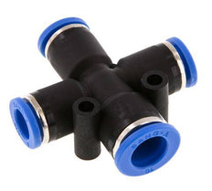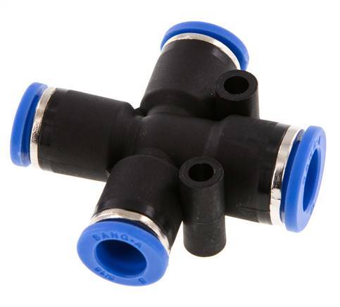 This is a 4 connection cross push-in fitting. Push-in fittings are ideal to create fast and reliable connections for pneumatic hoses. Connection 1 has a 10 mm push-in port and connection 2, 3 and 4 have 8 mm push-in port. The body is made of PA 66. The connection ports are made of PA 66. The seal material is NBR. The operating pressure range is -0.95 to 20 bar (-14 to 290 psi), making it suitable for vacuums. The fitting is suitable for temperatures from -20 to 80 °C (-4 to 176 °F). The push-in fitting is easily installed by pushing the pneumatic tube against the release ring-end of the fitting until it stops, and the internal claw secures it into place. It is easily uninstalled by pushing the release ring inward towards the fitting and pulling the tubing back.