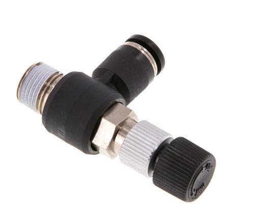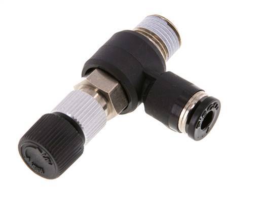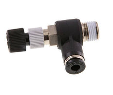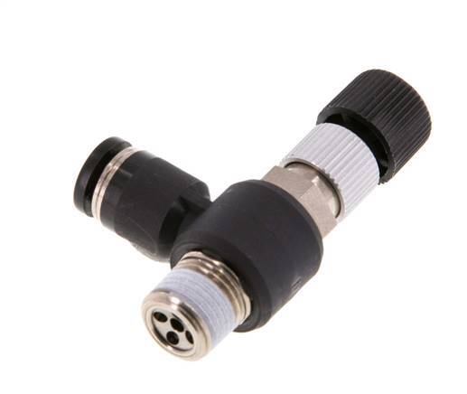 This is an elbow pneumatic differential pressure regulator for air pressure regulating and keeping it at a set value on the outlet side. It has a 4 mm push-in fitting on one side and an R 1/8 inch male threaded port on the other side. It is suitable for a maximum operating pressure of 9 bar (131 psi). The setting pressure ranges from 2 to 6 bar. Use the adjusting screw to set the desired pressure.