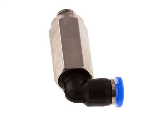 This is a 2 connection elbow push-in fitting. Push-in fittings are ideal to create fast and reliable connections for pneumatic hoses. Connection 1 is a 3 mm push-in port. Connection 2 has M 5 male threads. The male thread connection has an O-ring seal. The body is made of PBT. The connection ports are made of nickel plated brass and PBT. The seal material is NBR. The operating pressure range is -0.95 to 10 bar (-14 to 145 psi), making it suitable for vacuums. The fitting is suitable for temperatures from 0 to 60 °C (32 to 140 °F).