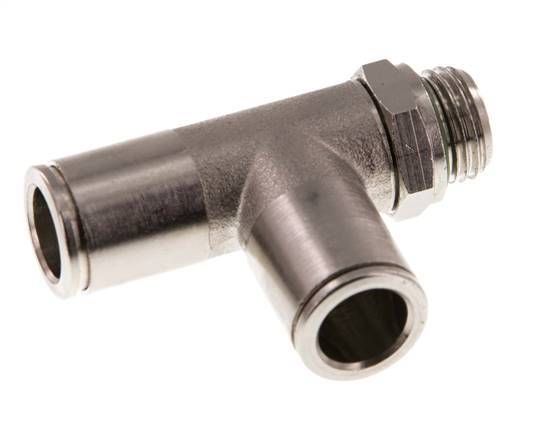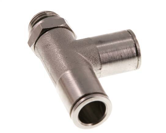 This is a 3 connection right angle tee push-in fitting. Push-in fittings are ideal to create fast and reliable connections for pneumatic hoses. Connection 1 and 2 are 10 mm push-in ports and connection 3 has G 1/4 inch male threads. The male thread connection has an O-ring seal. The body is made of brass. The connection ports are made of nickel plated brass. The seal material is FKM. The operating pressure range is -0.98 to 16 bar (-14 to 232 psi), making it suitable for vacuums. The fitting is suitable for temperatures from -20 to 150 °C (-4 to 302 °F). The push-in fitting is easily installed by pushing the pneumatic tube against the release ring-end of the fitting until it stops, and the internal claw secures it into place. It is easily uninstalled by pushing the release ring inward towards the fitting and pulling the tubing back.