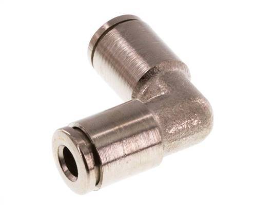 This is a 2 connection elbow push-in fitting. Push-in fittings are ideal to create fast and reliable connections for pneumatic hoses. Both push-in connections have a 4 mm size. The body is made of brass. The connection ports are made of nickel plated brass. The seal material is FKM. The operating pressure range is -0.98 to 16 bar (-14 to 232 psi), making it suitable for vacuums. The fitting is suitable for temperatures from -20 to 150 °C (-4 to 302 °F).