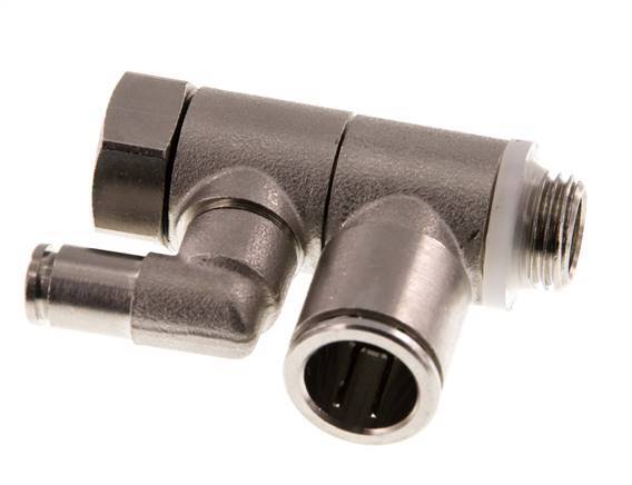 This is a nickel-plated brass pilot-operated check valve. Connection 1 has G 1/4 inch male threads and connection 2 has a 12 mm push-in fitting. It also has a 4 mm push-in actuating connection (check valve). The check valve function can be used for a short intermediate stop of the actuator. If there is control pressure on the 4 mm push-in port, flow can travel in both directions between connection ports 1 & 2. If there is no control pressure on the 4 mm push-in port, flow can only travel from connection 2 to connection 1. It has an NBR seal that makes it suitable for applications within a temperature range from -20 to 80 °C (-4 to 176 °F). The operating pressure range is 0.5 to 10 bar (7 to 145 psi). There is an arrow on the body of the fitting indicating flow direction.