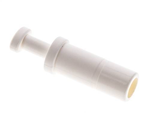 This is a plug for a push-in fitting. It has a 10 mm plug-in connection. The body is made of POM. The connection port is made of POM. The seal material is EPDM. The operating pressure range is -0.95 to 11 bar (-14 to 160 psi), making it suitable for vacuums. The fitting is suitable for temperatures from 0 to 65 °C (32 to 149 °F).