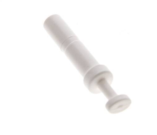 This is a plug for a push-in fitting. It has a 3/16 inch (4.76 mm) plug-in connection. The body is made of POM. The connection port is made of POM. The seal material is EPDM. The operating pressure range is -0.95 to 16 bar (-14 to 232 psi), making it suitable for vacuums. The fitting is suitable for temperatures from 0 to 65 °C (32 to 149 °F). The push-in fitting is easily installed by pushing the pneumatic tube against the release ring-end of the fitting until it stops, and the internal claw secures it into place. It is easily uninstalled by pushing the release ring inward towards the fitting and pulling the tubing back.
