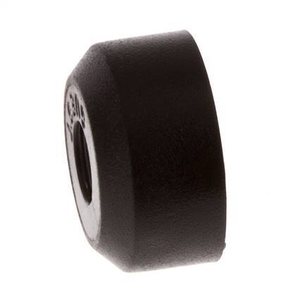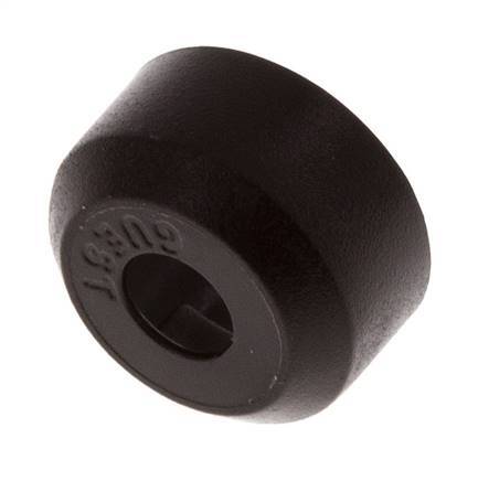 This is a safety cap for a push-in fitting. The body is made of POM. The connection port is made of POM. The operating pressure range is -0.95 to 16 bar (-14 to 232 psi), making it suitable for vacuums. The fitting is suitable for temperatures from -20 to 70 °C (-4 to 158 °F).